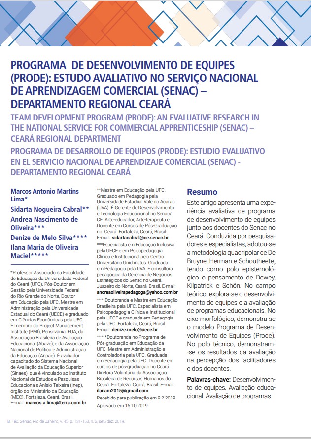 O presente artigo apresenta uma experiência avaliativa de Programa de Desenvolvimento de Equipes (PRODE) junto aos docentes do SENAC no Ceará. Conduzida por pesquisadores e especialistas, adotou-se a metodologia quadripolar de De Bruyne, Herman e Schoutheete, tendo como polo epistemológico o pensamento de Dewey, Kilpatrick e Schön. No campo teórico, explora-se o desenvolvimento de equipes e a avaliação de programas educacionais. No eixo morfológico demonstra-se o modelo Programa de Desenvolvimento de Equipes (PRODE) de dominio exclusivo do IAGEE – Instituto de Avaliação & Gestão Educacional. No polo técnico, demonstram-se os resultados da avaliação na percepção dos facilitadores e dos docentes.